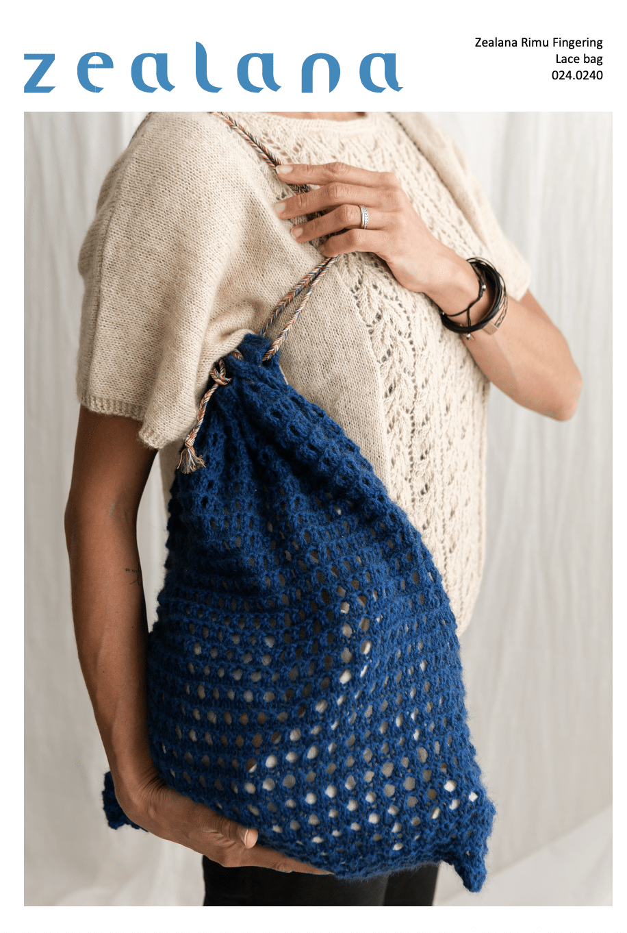 This pattern contains a Lace Bag (024.0240) knitted in Zealana Rimu Fingering